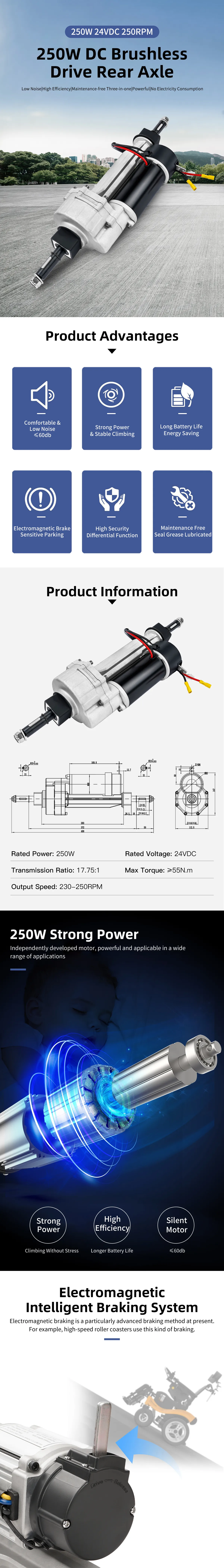 This 24V 250W tricycle hub motor rear differential axle is designed for optimal power output and efficiency. With its advanced gearing system, it offers superior performance and reliable operation in a range of terrains and weather conditions.